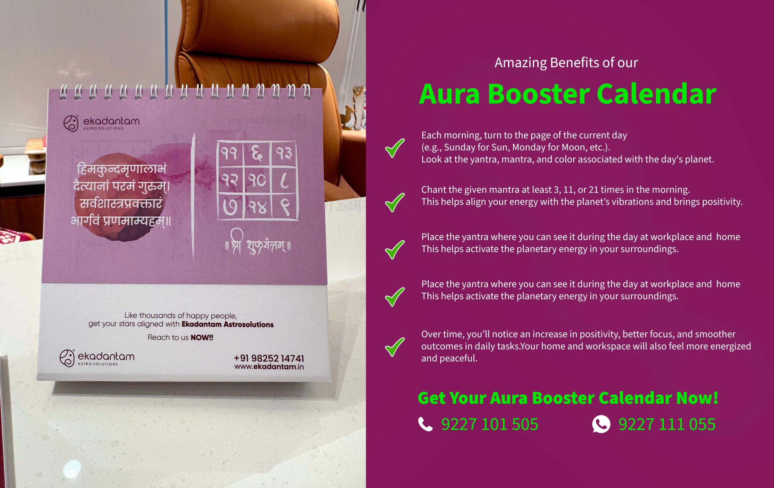 The Energy Alignment Calendar is a transformative tool that helps you align your daily life with the natural rhythms of the universe. Each day is infused with planetary guidance, empowering color frequencies, numerological insights, and energy-boosting mantras. More than just a schedule, this calendar is a holistic daily guide for well-being, productivity, and spiritual growth.Perfect for homes, offices, or personal use, it helps you make intentional choices that enhance your environment, elevate your mindset, and unlock your full potential—one day at a time.